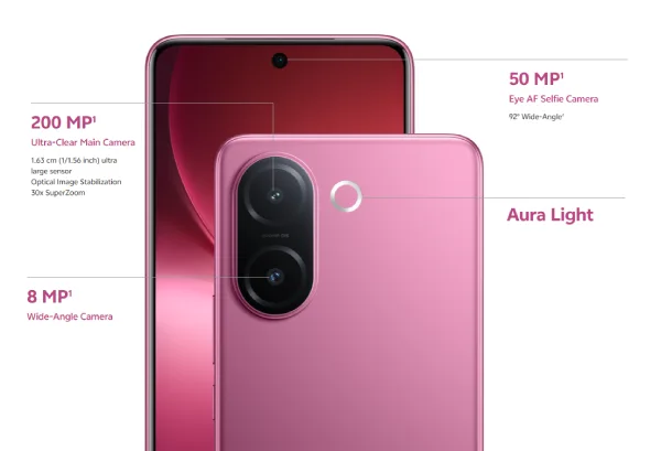 أبرز ما يميز هاتف vivo V60e هو الكاميرا الخلفية الرئيسية بدقة 200 ميجابكسل مع تثبيت بصري OIS وفتحة عدسة f/1.8، إلى جانب عدسة فائقة العرض بدقة 8 ميجابكسل بزاوية رؤية 120 درجة.