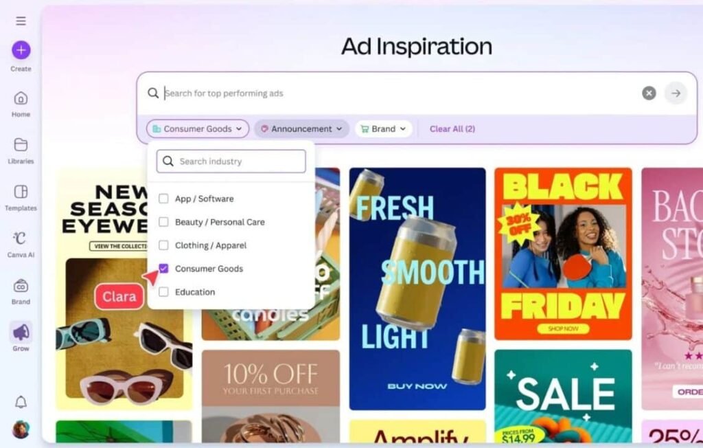وتُقدّم ميزة Canva Grow أدوات لإنشاء إعلانات متوافقة مع هوية العلامة التجارية، مع النشر المباشر عبر منصات التواصل الاجتماعي، وتتبع الأداء عبر تقارير مدعومة بالذكاء الاصطناعي.
