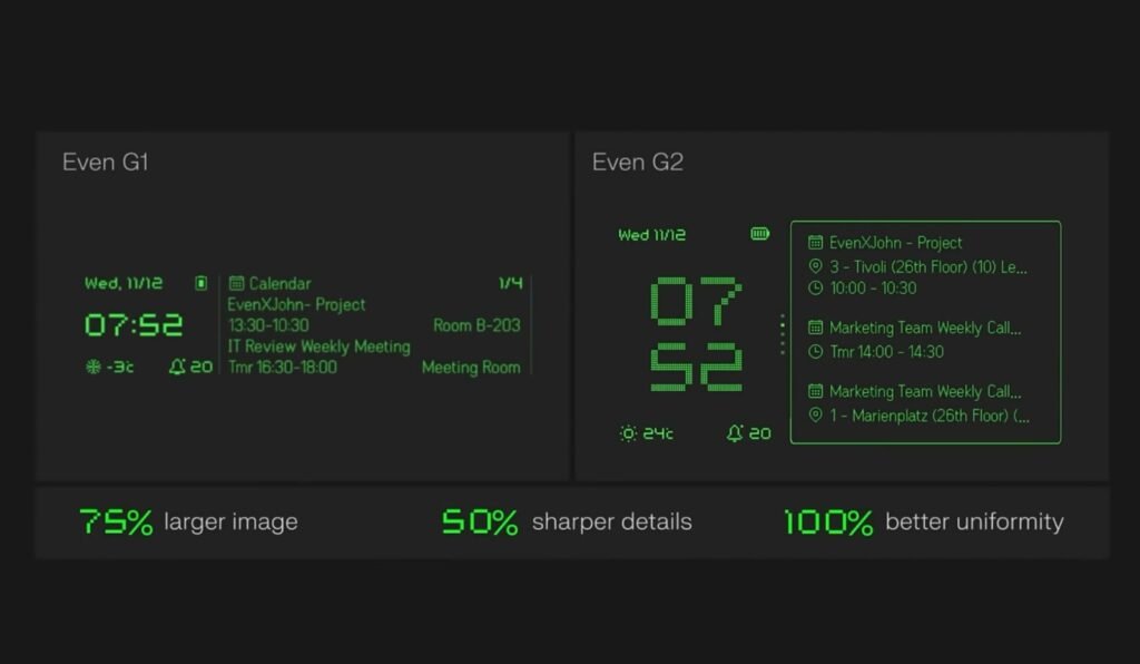 وفي حين أن نظارة Even G1 كانت توفر خيار ضبط المسافة الافتراضية للعناصر المعروضة، فإن Even G2 تضيف إلى ذلك مستوى عرض إضافياً يفصل تلقائياً بين خطوط المعلومات.