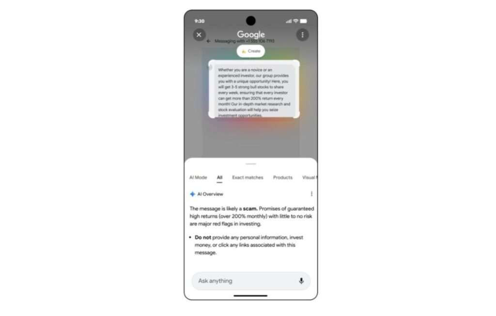 حصلت ميزة “التدوير للبحث Circle to Search” على تحديث مهم يتيح تحليل الرسائل المشبوهة. فعند تفعيل دائرة البحث، يظهر ملخص بالذكاء الاصطناعي يوضح احتمال كون الرسالة محاولة احتيال أو طبيعية.