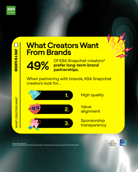 عقدت سناب شات، بالتعاون مع شركتي بوبليسيس ميديا الشرق الأوسط وإبسوس، دراسةً جديدة في المملكة العربية السعودية لفهم ما يريده صناع المحتوى من منصات التواصل الاجتماعي والعلامات التجارية ومتابعيهم. وتناولت الدراسة طريقة تعامل صناع المحتوى مع مختلف المنصات التي ينشرون عليها، والأدوات التي يستخدمونها، وما يطلبونه من شراكات العلامات التجارية، وكيف ينظرون إلى جمهورهم.