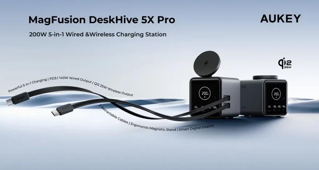 كشفت شركة AUKEY عن محطة شحن مكتبية MagFusion DeskHive 5X Pro في معرض CES 2026، والتي تستهدف المهنيين الذين يحتاجون إلى حلول شحن فعالة لأجهزة متعددة في بيئات العمل المكتبية المدمجة. تجمع محطة الشحن 5 في 1 بين قدرات الشحن السلكي بقوة 200 واط والشحن اللاسلكي Qi2 بقوة 25 واط وإدارة الكابلات الذكية وشاشة عرض للطاقة في الوقت الفعلي.