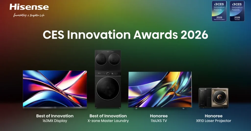 شملت جوائز Hisense في معرض CES 2026 أربع جوائز CES للابتكار، حيث نال كل من جهاز 163 MX وجهاز X-zone Master جائزة أفضل ابتكار. بالإضافة إلى ذلك، حاز كل من تلفاز 116UXS RGB MiniLED TV وجهاز العرض الليزري XR10 على جائزة الابتكار، مما يسلط الضوء على قوة Hisense في كل من شاشات العرض المتطورة والأجهزة المنزلية. يعكس هذا الاعتراف الشامل التزام الشركة بالابتكار عبر فئات منتجات وحقول تكنولوجية متعددة.