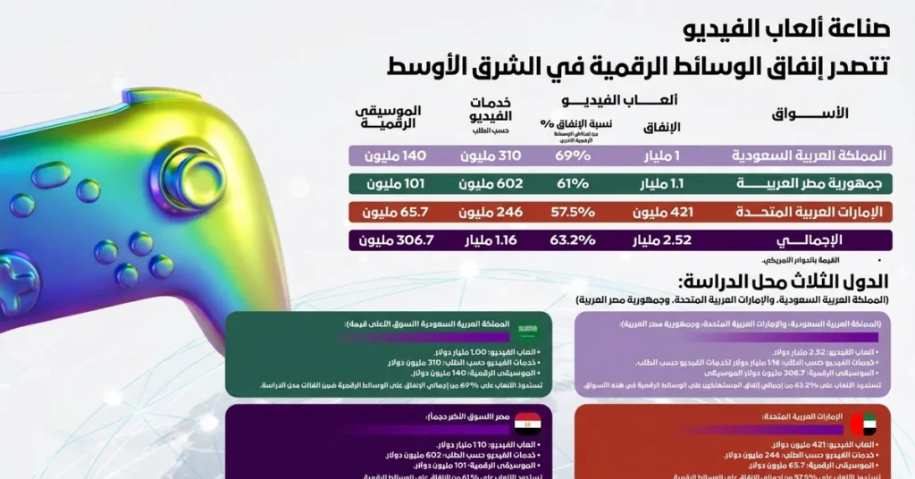 بيّنت الدراسة أن إجمالي الإنفاق على ألعاب الفيديو في الأسواق الثلاثة الرئيسة، المملكة العربية السعودية والإمارات العربية المتحدة وجمهورية مصر العربية، بلغ نحو 2.52 مليار دولار خلال عام 2024، مقارنة بـ 1.16 مليار دولار لخدمات الفيديو حسب الطلب، و306.7 مليون دولار للموسيقى. وبذلك تستحوذ الألعاب على 63.2% من إجمالي إنفاق المستهلكين على الوسائط الرقمية في هذه الأسواق.