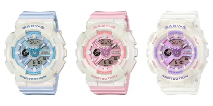 وقد تم إطلاق ثلاث ساعات جديدة من سلسلة “Casio G-Shock Baby-G BA-100” في اليابان، وتتميز هذه الطرازات بتصميمات ذات ألوان “باستيل”، ويتم تسويقها على أنها “عملية للغاية وعالية الوظائف”. وتتمتع ساعات “Baby-G BA-100PD” بإطار وهيكل وسوار من الراتينج المستقطب للحصول على لمسة نهائية لامعة، كما توجد زخارف على شكل قلب على عقرب الساعات ولمسة معدنية عند موضع الساعة 3. وتأتي الساعات بتصميمات متنوعة، حيث يتميز طراز “BA-110PD-2A” بوجه وسوار باللون الأزرق، بينما يأتي طراز “BA-110PD-4A” بلمسات وردية عبر المينا والسوار، في حين يتمتع طراز “BA-110PS-7A” بمينا باللون الوردي والأرجواني مع سوار شفاف.