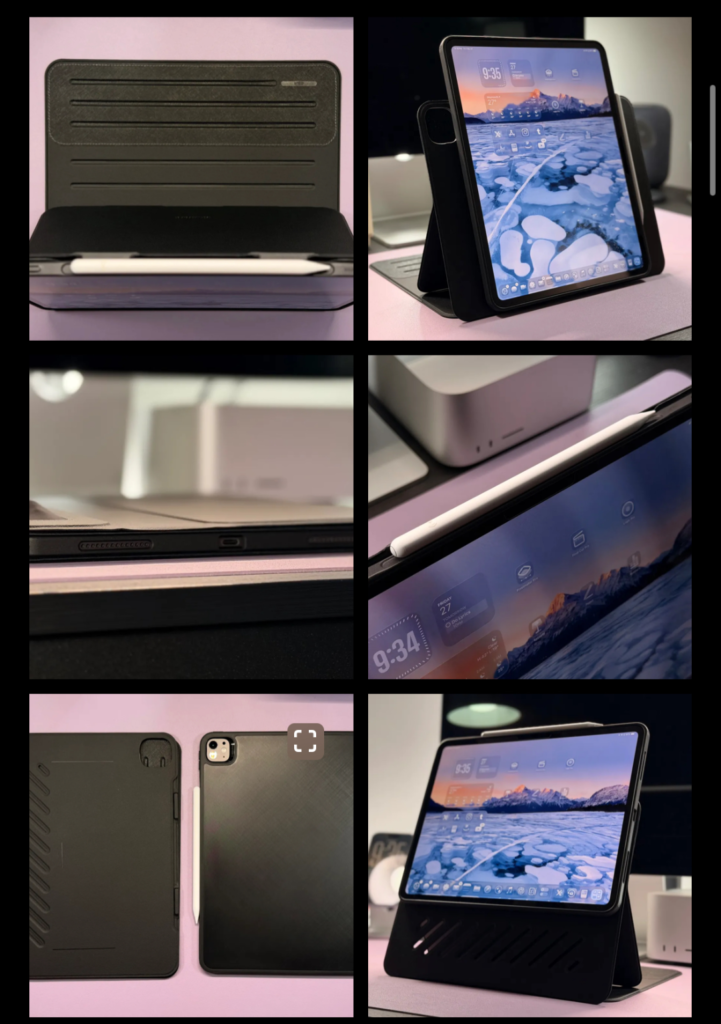يبدأ التصميم بهيكل أساسي يحمي iPad، ثم يُضاف إليه جزء أمامي مغناطيسي يوفر زوايا عرض متعددة، سواء في الوضع الأفقي أو الرأسي، مع إمكانية رفع الجهاز لمستوى أعلى يناسب مشاهدة الفيديوهات.