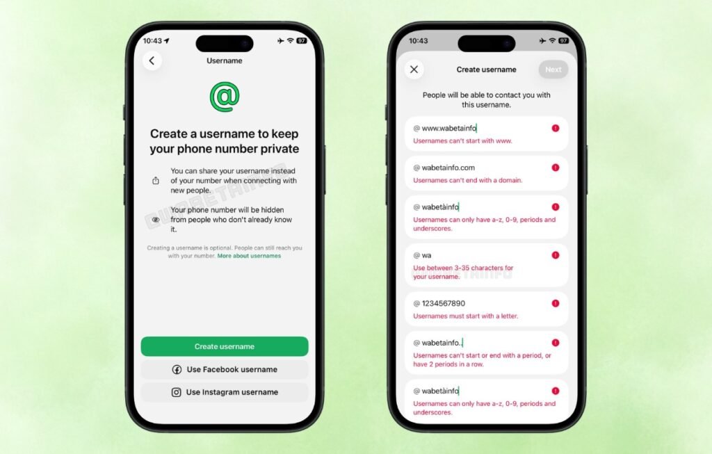 وتفرض واتساب مجموعة من الضوابط على أسماء المستخدمين، أبرزها احتواء الاسم على حرف واحد على الأقل، واستخدام أحرف إنجليزية صغيرة أو أرقام أو نقاط أو شرطات سفلية فقط، وألا يبدأ الاسم بـ”www” أو ينتهي بنطاقات مثل “.com”، وألا يبدأ أو ينتهي بنقطة، وأن يتراوح الطول بين 3 أحرف و 30 حرفًا.