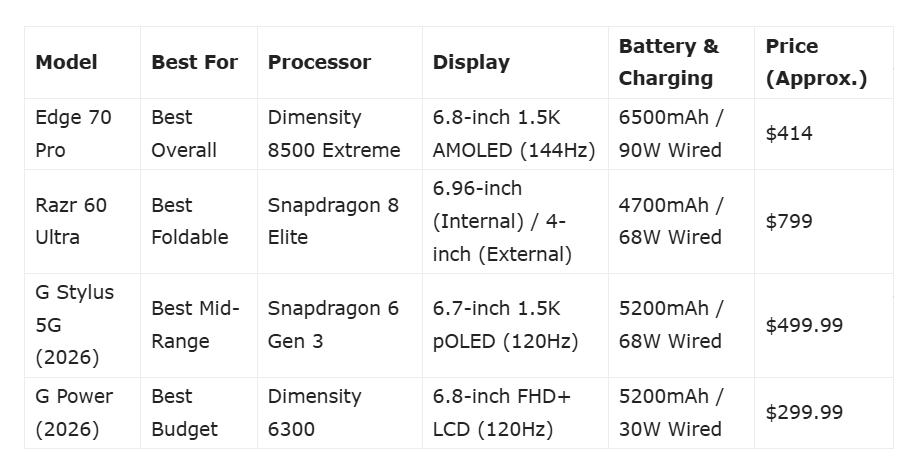 تُظهر تشكيلة 2026 أن “موتورولا” لم تعد مجرد لاعب ثانوي في سوق الهواتف، بل أصبحت منافساً حقيقياً يقدم قيمة قوية مقابل السعر.